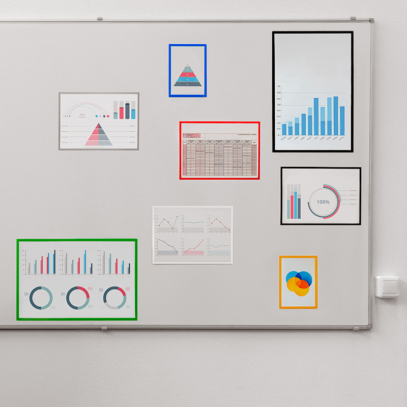 One of the best products available to display frequently changing documents on whiteboards, metal cabinets, or machinery. Place papers in a magnetic display pocket without tape or pins. Use in meeting rooms, general noticeboards, or production scheduling. View choices like A4 magnetic display windows in a range of colors for visual differentiation.