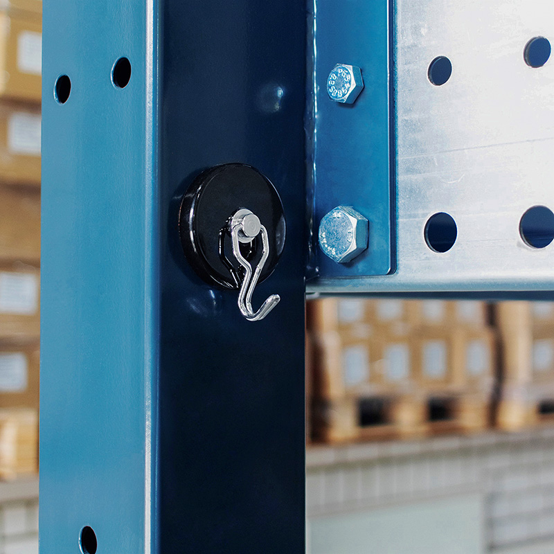 The super powerful holding force of this stylish black painted Ø60mm 360° Anisotropic magnetic hook allows you to hang heavy objects or tools at any steel surface in your shop, at home, your office, warehouse, kitchen or garage. Suitable for displaying of decorations, point of sale signs or banners, organising cables and wires.